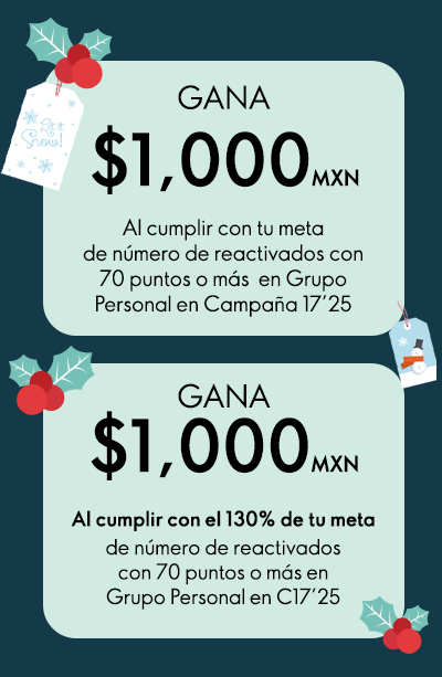 Promoción vigente del 06 al 26 de diciembre del 2025 (Campaña 17’25). Todos los Líderes 12% o superior al cierre de Campaña 16’25 participan en la promoción sin importar si fueron calificados o empujados./ Se considerará el grupo personal al cierre de Campaña 16’25./ Para el cumplimiento de meta en grupo personal se considerarán todos los Members y/o Socios* cuya última compra con puntos fue en Campaña 15’25 (Inactivos 2 o antes) que tengan al menos 70 puntos o más cada uno./ Para ganar $1,000 pesos mexicanos los Líderes participantes deberán cumplir con su meta de número de reactivados./ Para ganar $1,000 pesos mexicanos adicionales, los Líderes participantes deberán cumplir mínimo con el 130% del total de su meta de número de reactivados./ Los Líderes participantes deberán realizar 100 puntos personales y cerrar al mismo Nivel o alguno superior calificado al cierre de Campaña 16’25. / Las devoluciones y/o cancelaciones de los pedidos de los Members y/o Socios* reactivados o Líderes participantes que se realicen durante la vigencia del programa les restarán puntaje acumulado en la Campaña y podrán ocasionar la pérdida del premio. / Las metas de reactivación de cada participante las podrás consultar en el minisitio del programa. / Los bonos están expresados en moneda nacional y los impuestos que correspondan serán descontados del monto publicado al momento de realizar el pago que se realizará en la primera semana de Campaña 01’26 en una sola exhibición vía transferencia interbancaria a la cuenta CLABE que se tenga registrada y validada en el perfil de su cuenta Oriflame. En caso de no tenerla, el Líder* deberá registrar y validar una cuenta CLABE. También deberá tener validado su CURP y Constancia de Situación Fiscal. / En caso de que un Líder participante no cumpla con alguna de las condiciones anteriores, no se someterá a revisión ni se hará excepción alguna. / Los Líderes participantes aceptan los términos y condiciones de este programa y Oriflame tendrá la última decisión para confirmar a un Líder* como ganador basándose en el Código de Ética, así como en los procedimientos internos. *Se entiende como “Socio” al Distribuidor Independiente Oriflame.